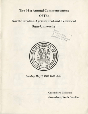 Complete 20 page bulletin from Sunday, May 9, 1982, 11:00 A..M. at the Greensboro Coliseum in Greensboro, North Carolina. The Commencement Address was given by Carl B. Stokes, Former Mayor of Cleveland, Ohio.