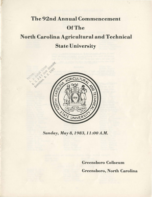 Full program for the commencement Sunday, May 8, 1983, 11 :00 A.M. at the Greensboro Coliseum in Greensboro, North Carolina. The commencement address was given by the The Honorable Edolphus Towns '1956, U. S. Congressman, and alumni of North Carolina A&T State University.