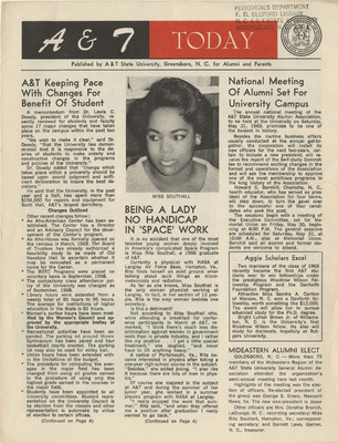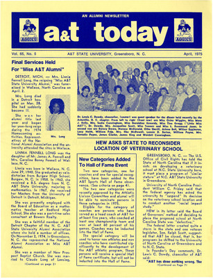 Headlines include the passing of Mrs. Linnea Fennell Long the reigning "Miss A&T Alumni", The 1974 inductees into the Sports Hall of Fame and the controversy over the location of a veterinary school on the A&T campus.