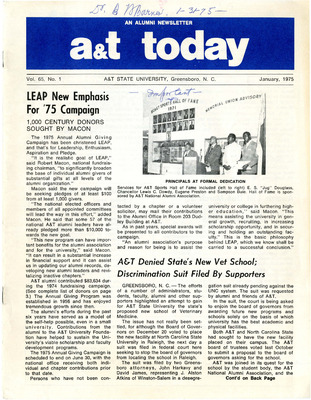 Headlines Include the 1975 Annual Alumni Giving Campaign called Leadership, Enthusiasm, Aspiration and Pledge or "LEAP"; the controversy about the Veterinary School being located at A&T, and the donors to the 1974 Annual Fund.