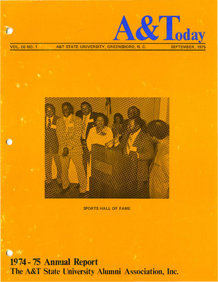 Cover photo with the Sports Hall of Fame, and the 1974 - 75 Annual Report of The A&T State University Alumni Association, Inc.