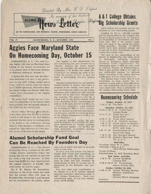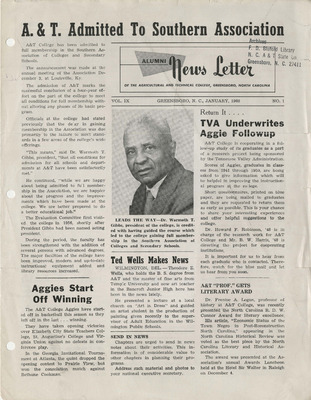 This rare edition of the Alumni News Letter features a group photo of the Alumni Scholarship recipients. Among the students in the photo are Ezell Blair Jr. (Dr. Jibreel Khazan), Joseph McNeil and David Richmond, 3 of the famous A&T Four. This edition was published just a month before February 1, 1960, the beginning of the Woolworth Sit-Ins in Greensboro.