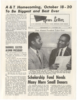 Front page article about Howard C. Barnhill '1938 being elected as the new president of the A&T Alumni Association. A photo obituary of agriculture legend S. B. Simmons '1914 and the retirement of E. Ray Hodgin as secretary-treasurer of the college since 1926. News of Miss A&T and Bert Piggott being elevated to head football coach. The 1957 Homecoming schedule is also included.