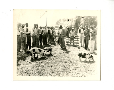 Group of men gathered around hogs.