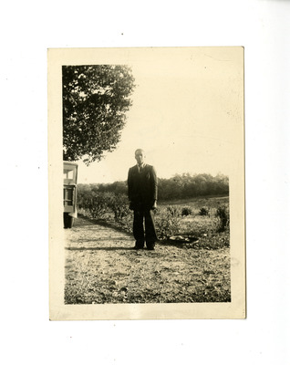 Man in suit standing next to car. Labeled 'Constar Lace.'