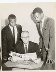 Photo of three men reading Agricultural Education, one sitting at a desk while two stand.