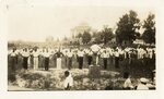 Photo of men doing group exercises, domed building in background.