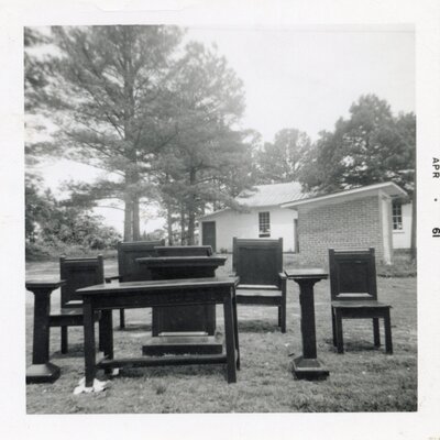 Wooden church furniture sitting on grass yard with a white building in the background.