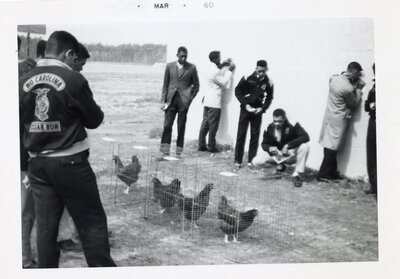 Young men observing chickens in cages. The young man on the left is wearing a jacket with the NFA crest that reads 'No. Carolina, Cedar Run.'