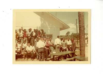 Group of people gathered outside around picnic tables. In envelope labeled 'Camp Pictures, Nash Central Camp Program.'