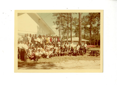 Large group of people gathered outside of a building. In envelope labeled 'Camp Pictures, Nash Central Camp Program.'