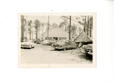 Cars parked in front of building and tent at S. B. Simmons camp.