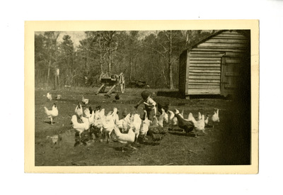Child feeding chickens. Labeled 'C. J. Belhaven.'