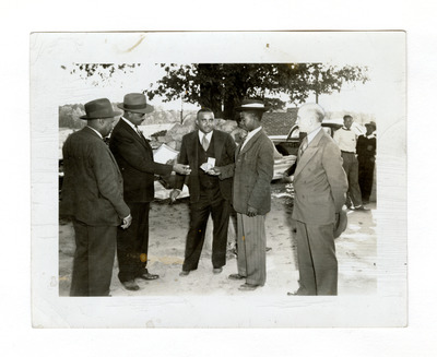 NFA members visit Oxford Orphanage during special "State-wide Fund-Raising Project." Left to right: T. A. Hamme, Superintendent of the Orphanage; S. B. Simmons, Superintendent for Negro Schools; J. T. Locke, Teacher of Agriculture; NFA member, student; and State Supervisor of Vocational Agriculture in North Carolina, Roy H. Thomas. There are food products, a car, and two young men in the background.
