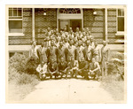 A large group of men in front of a brick building.