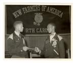 Two young men in NFA jackets holding a gavel, with Frank Bullock on the right, in front of a flag titled "NFA, North Carolina."