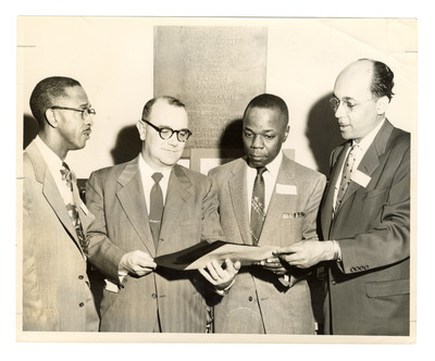 Four men, including Frederick Williams and Llewellyn Wise, standing in front of a plaque observing documents.