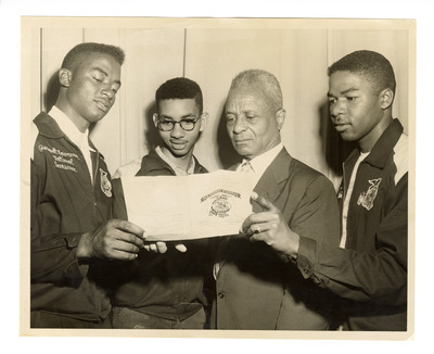 Three young men from the NFA and W. T. Gibbs (a former Chancellor of A&T) looking at the New Farmers of America's "Program of the 29th Annual Convention."