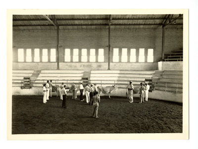 Young men in an indoor arena with cattle. In envelope labeled 'Aggieland Studies.'