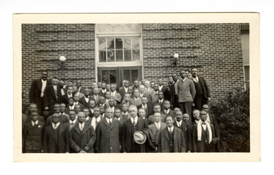 Group of men standing on steps outside a brick building. Former A&T Chancellor F.D. Bluford is standing to the left of the man holding a hat in his hand. (1st row)