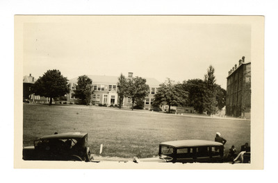 Two cars and people in front of a field with buildings. Labeled 'Blaine.'