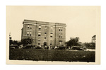 Cars and people in front of brick building. Labeled 'Blaine.'
