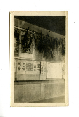 Posters of livestock on a wall beneath dried plants.