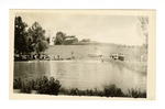 People in the water and others gathered around it with a barn, house and crops in the background.