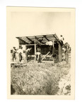 Young men working in a field constructing a chicken coop, with two of them holding chicken wire.